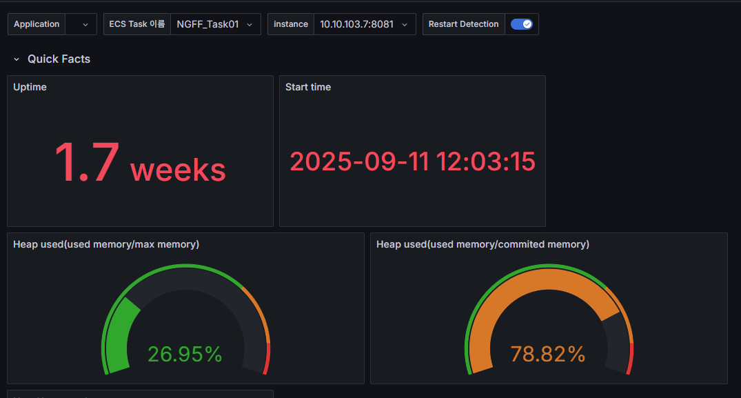 1.7주간 운영되면서 JVM이 이미 committed heap을 78%까지 확보한 상태였지만, 실제 사용(used)은 27% 수준으로 안정적이었습니다.