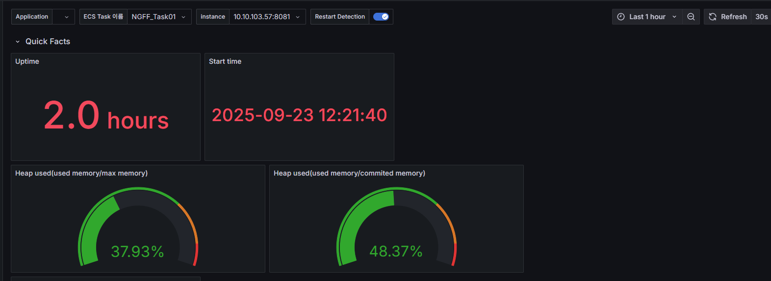 ECS + JVM 환경에서 메모리를 모니터링할 때는 OS 레벨 지표(mem_used_percent)와 JVM 레벨 지표(Heap Used/Committed)를 함께 보는 것이 중요합니다.