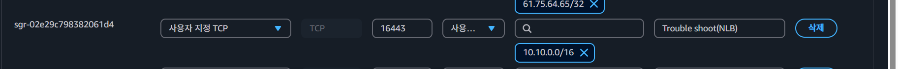 보안 그룹에 해당 포트(16443)에 대한 NLB 네트워크 대역 인바운드 규칙을 추가했습니다.
