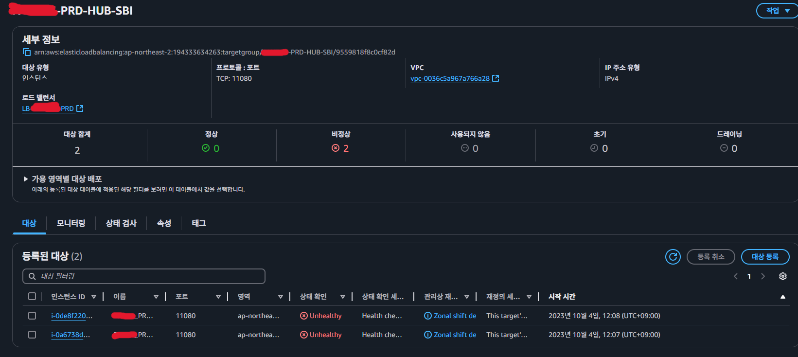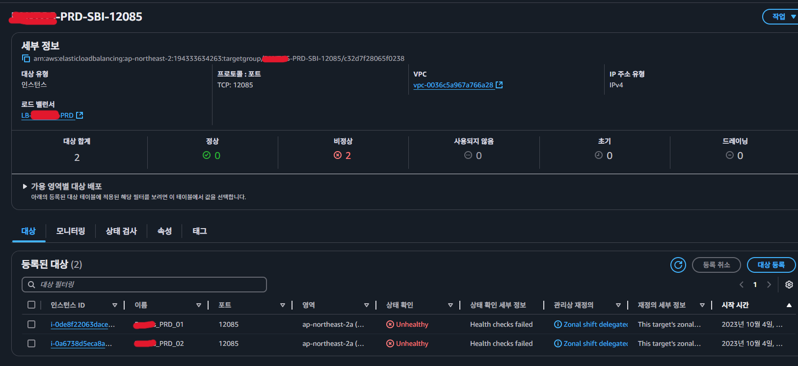 같은 점검 과정에서 포트 12085를 사용하는 타겟 그룹도 Unhealthy 상태인 것을 확인했습니다.