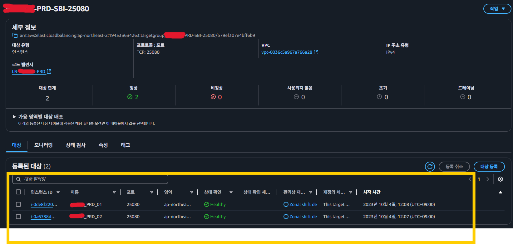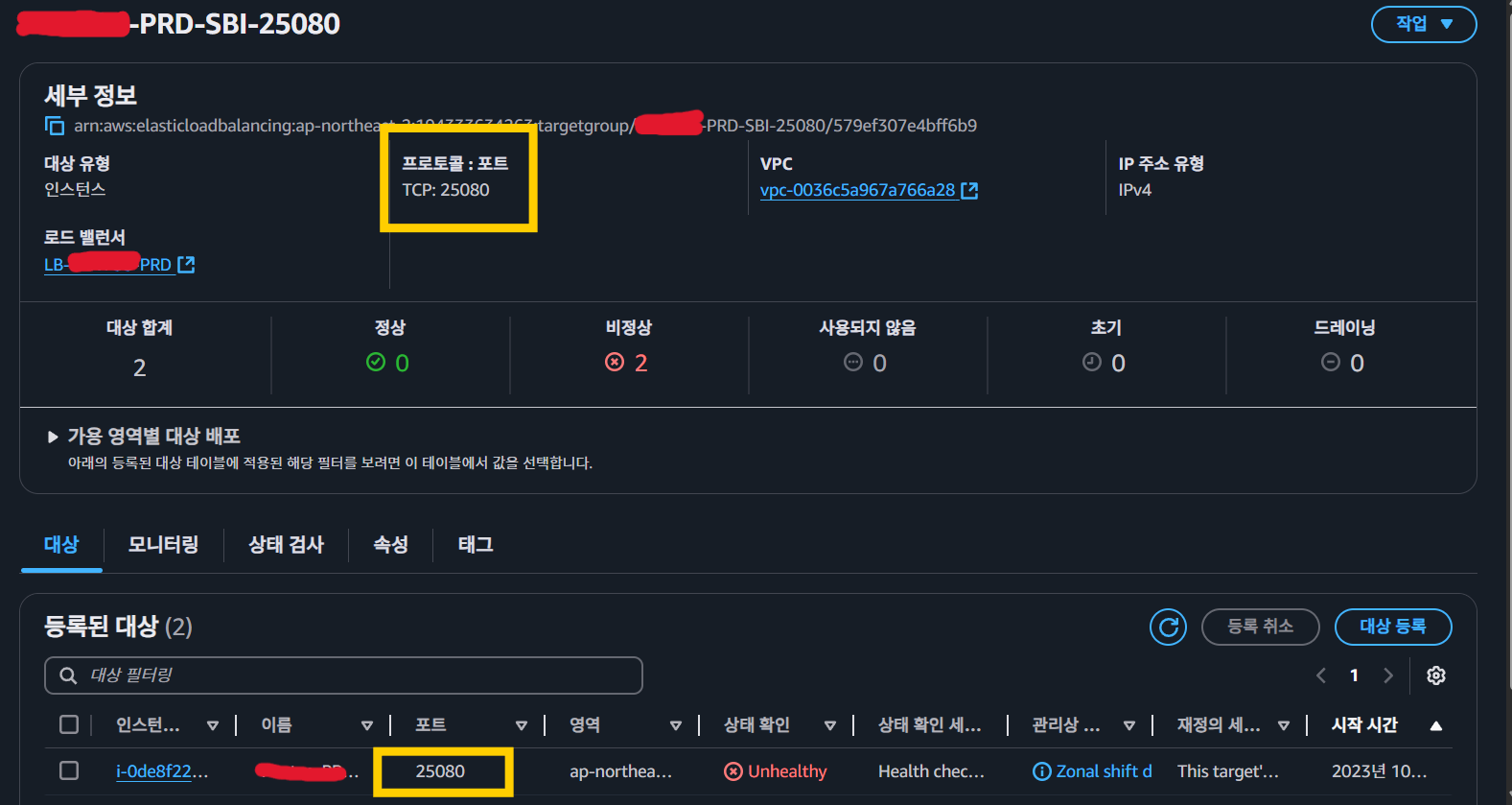 두 번째 타겟 그룹(포트 25080)의 경우, 보안 그룹을 열어줘도 여전히 Unhealthy 상태가 지속되었습니다.