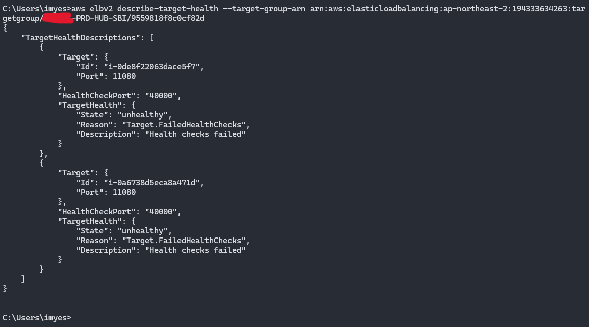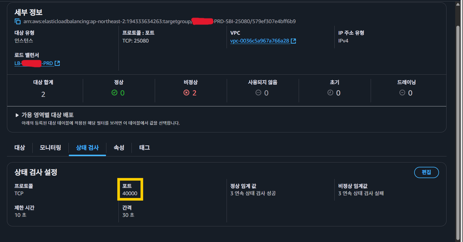 AWS CLI로 타겟 헬스를 조회한 결과, HealthCheckPort가 40000으로 설정되어 있었습니다. 실제 트래픽 포트(25080)와 완전히 다른 포트였습니다.
